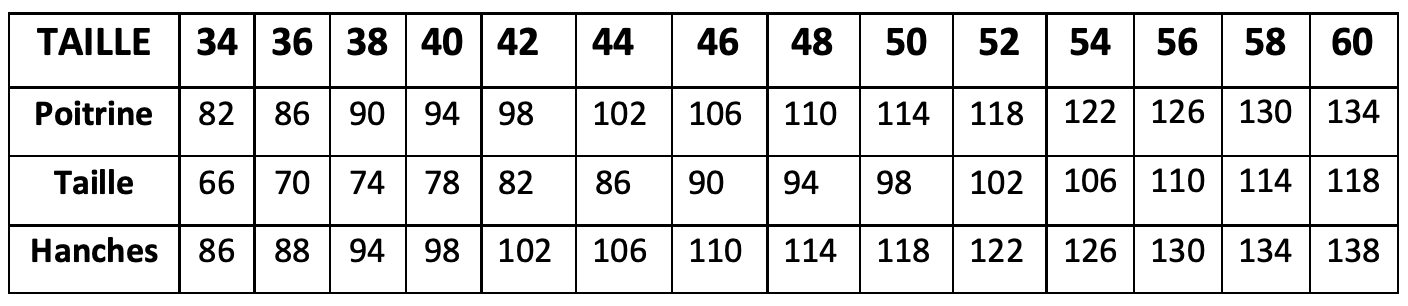 Tailles 34 / 36 / 38 / 40 / 42 / 44 / 46 / 48 /50 / 52 /54 /56 /58 / 60
