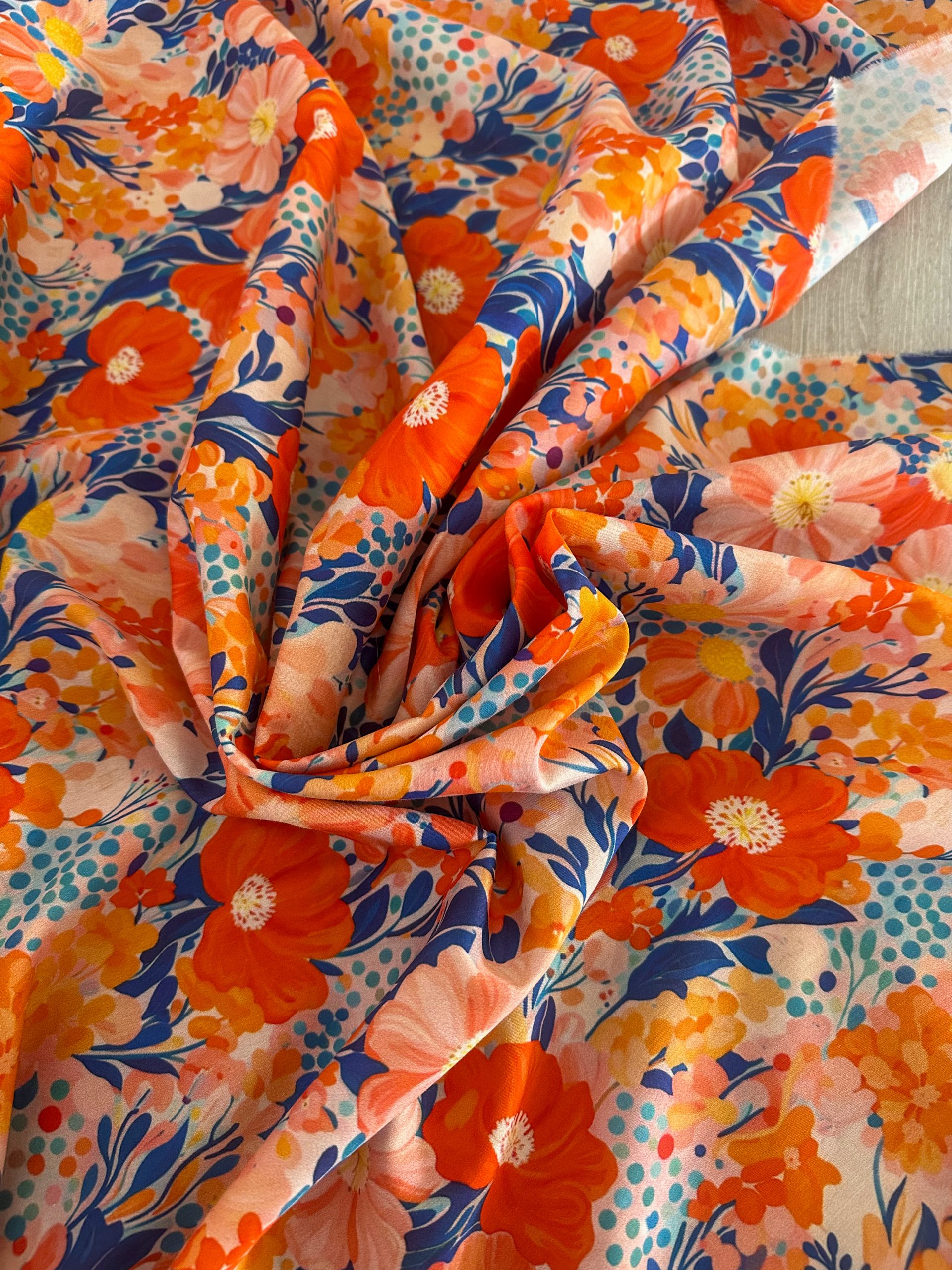 Fiore un tissu lumineux et vibrant inspiré des paysages ensoleillés de l’Italie. Son imprimé floral généreux et  délicates et un feuillage graphique dans une palette chaleureuse de corail, orange solaire, rose poudré et bleu. Légèrement satiné, les couleurs dansent avec harmonie et apportent une touche à la fois fraîche, féminine et pleine de caractère.